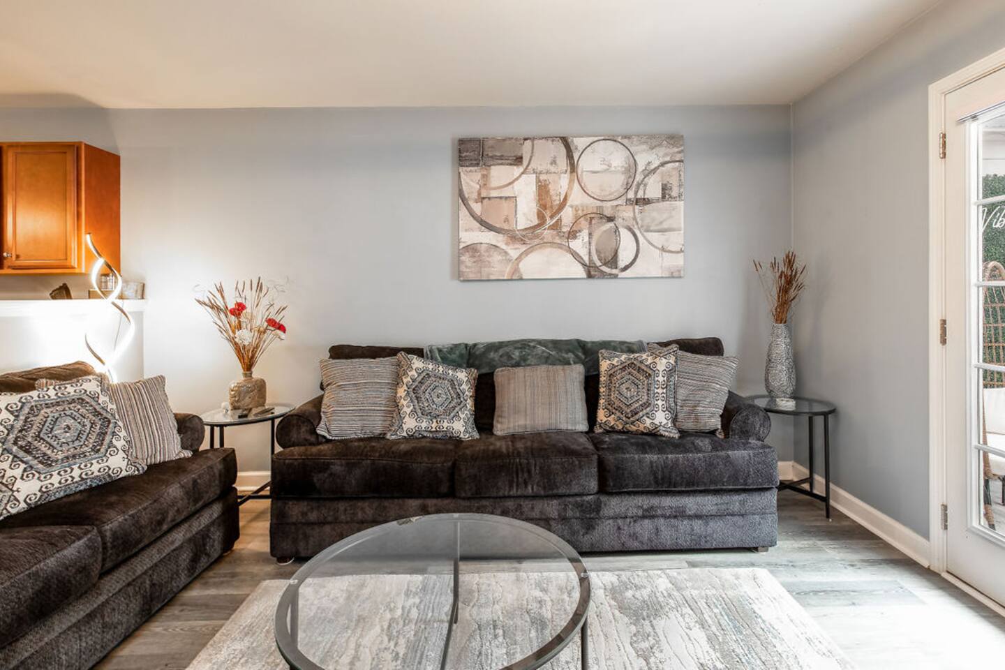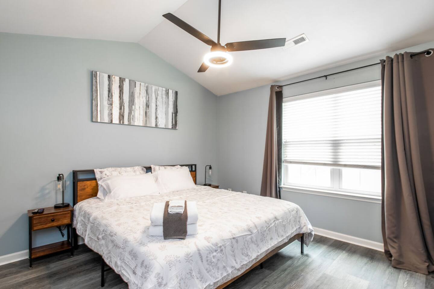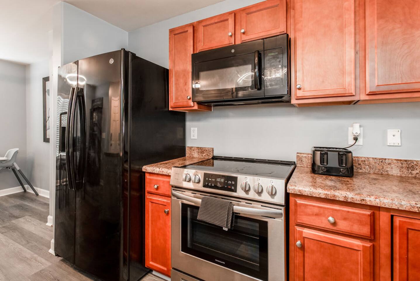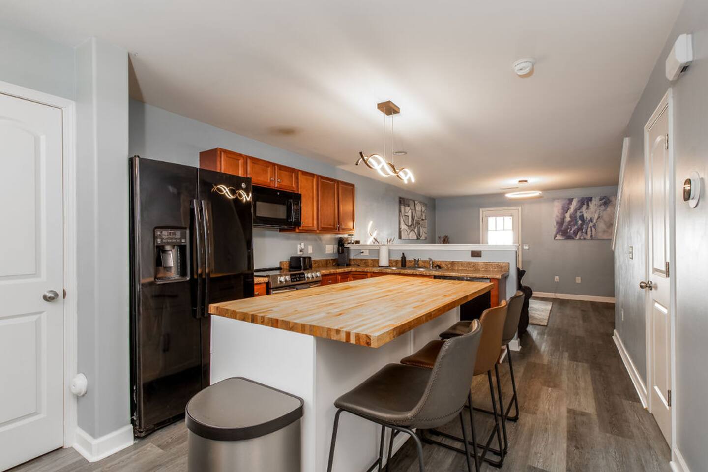 Welcome! To your most comfortable stay. The thoughtfully updated property features all new appliances, and a spacious Kitchen, perfect for culinary enthusiasts. Open floor plan leads you to the living room with comfy new Sofas and big flat screen TV! 2nd fl., discover a generously sized primary bedroom with spacious closets, and a bathroom with double sinks and a linen closet. A well-appointed 2nd bedroom, full bathroom, & Laundry room, complete the upstairs.