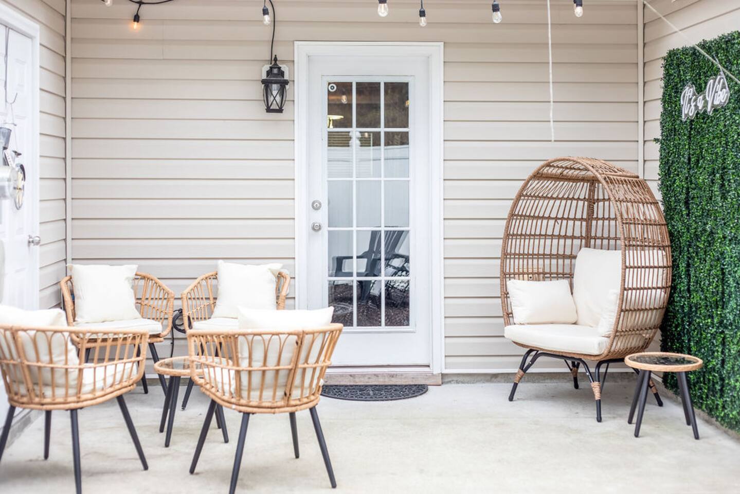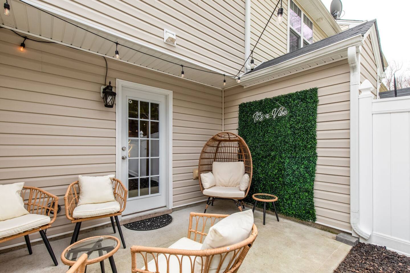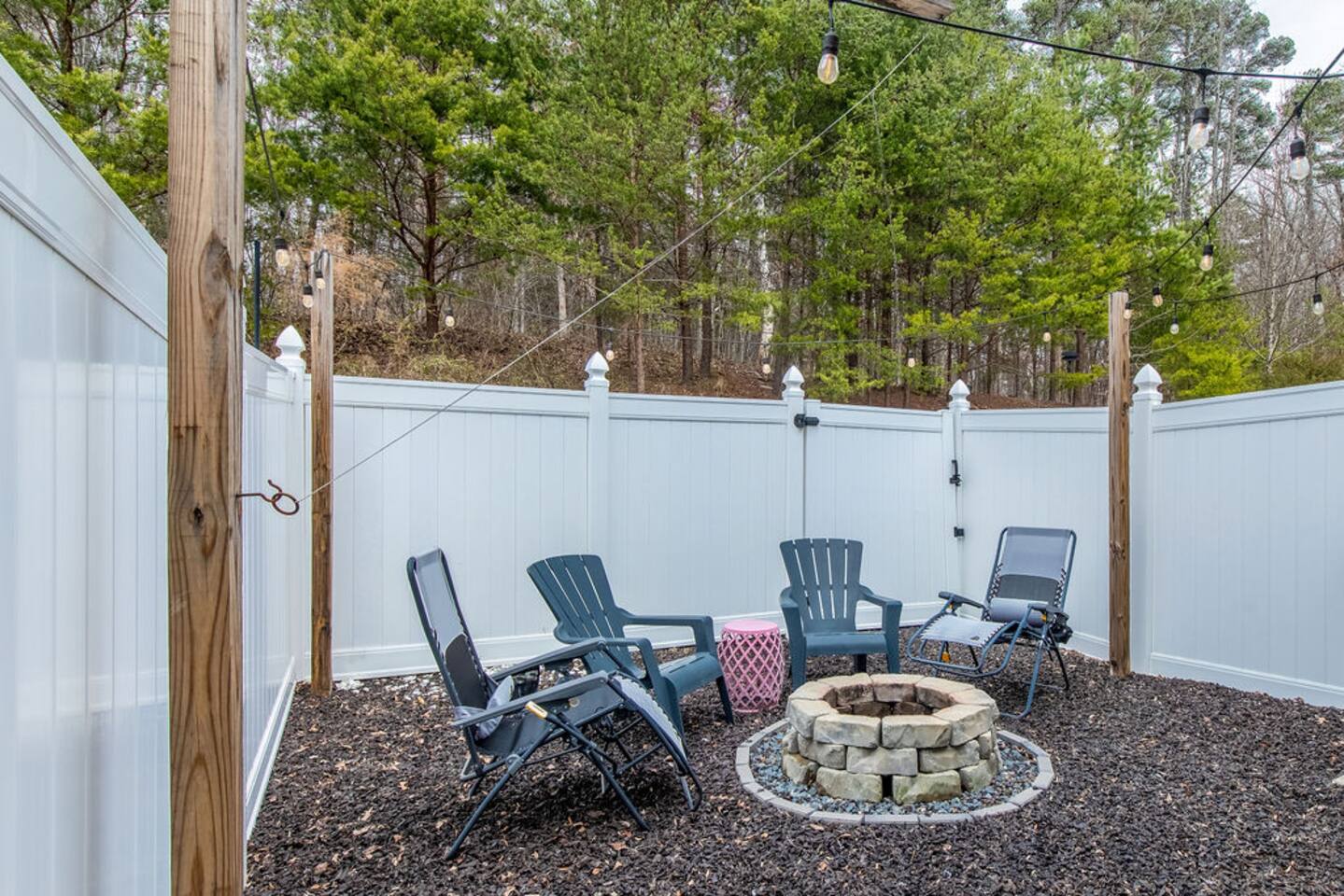 There are 15 stairs in the property and they are steep and there is no railing. Out back the patio is fenced in with a fire pit and seating. Please note that one of our sleeping accommodations is an air mattress that accommodates 2 people.
