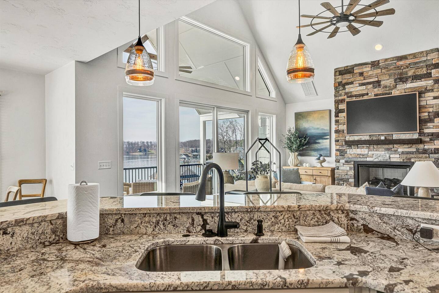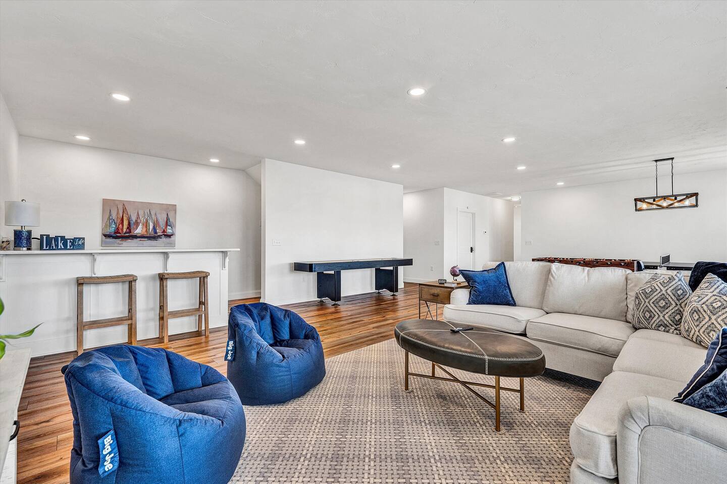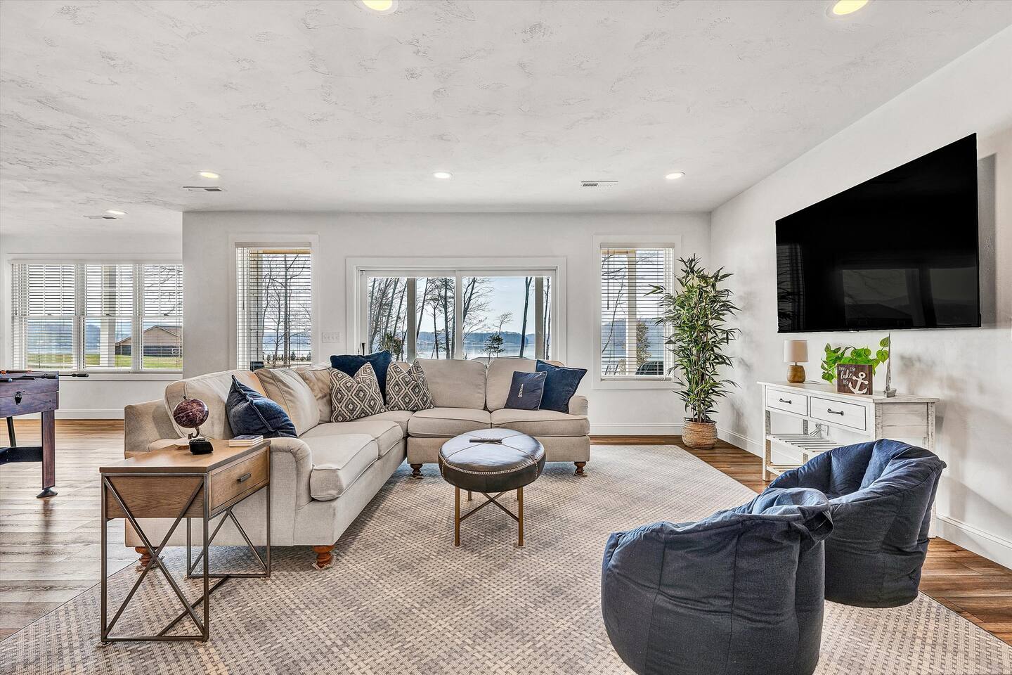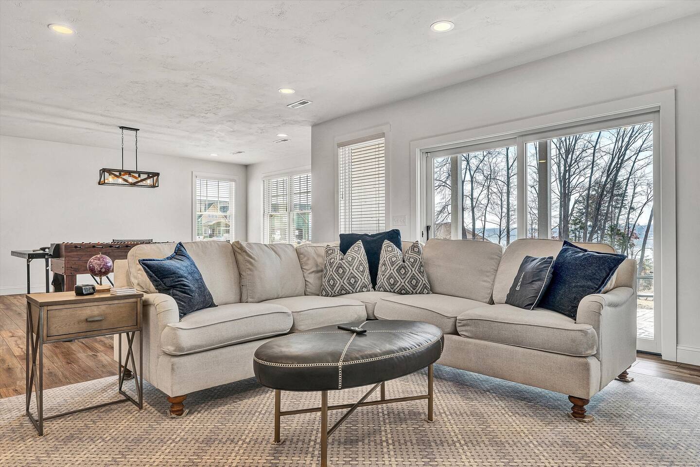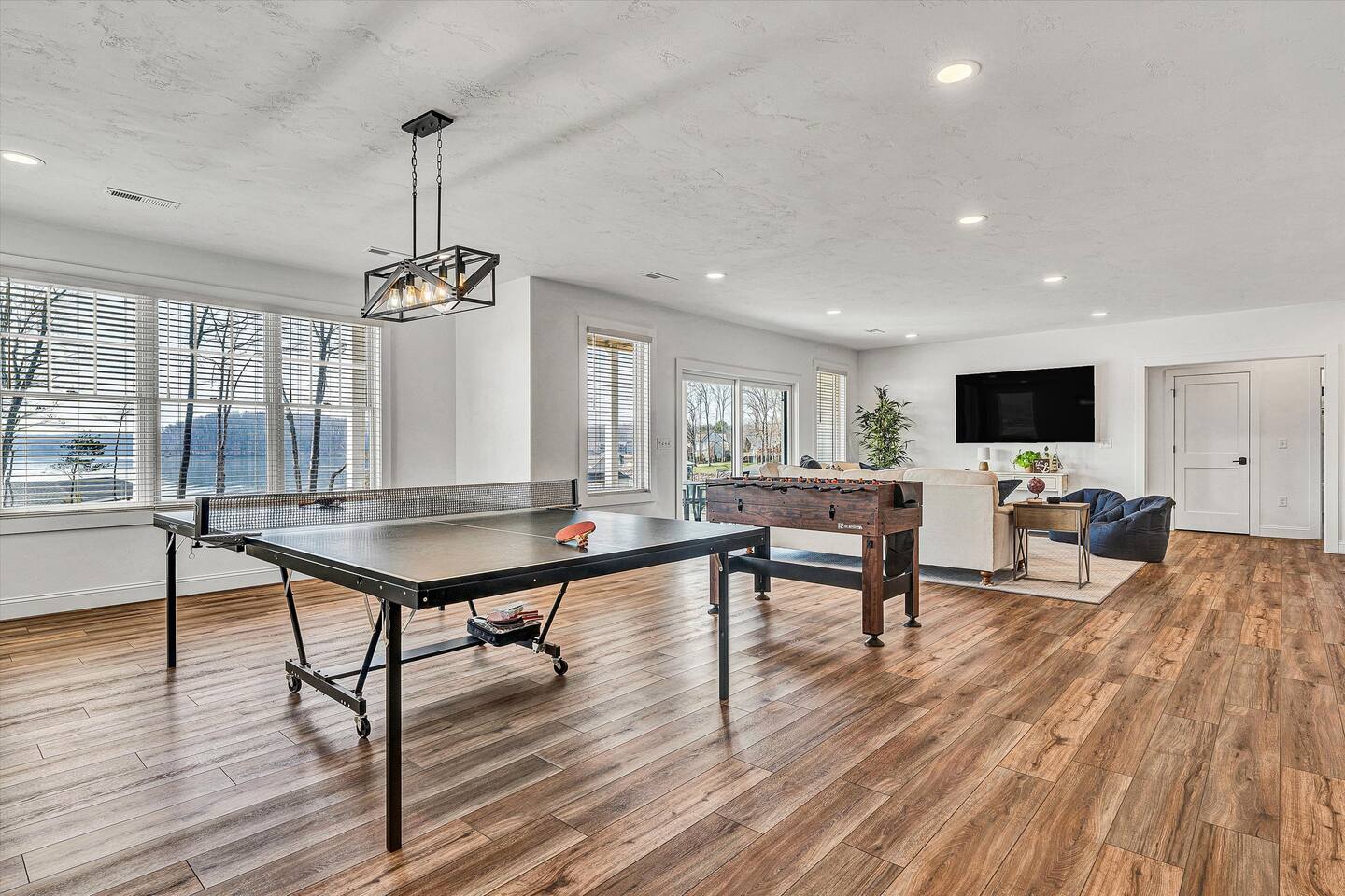 Escape to this stunning 4600 sq ft new construction lakefront retreat with breathtaking water views and space for everyone to relax. Enjoy mornings on the covered deck, evenings around the fire pit, and endless fun in the game room with ping pong, shuffleboard, and foosball. The home features spacious bedrooms, modern finishes, and a bright open layout. Perfect for families looking for a peaceful getaway with entertainment, comfort, and beautiful lake scenery just steps away.